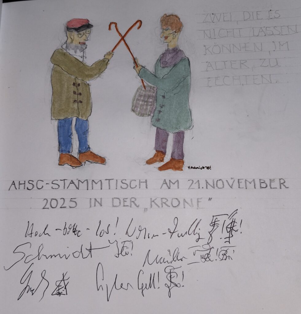 In einer dunklen und kalten Novembernacht des 21.11.2025 traf sich die unentwegte Schar tapferer AHSC-Mitglieder zum Novemberstammtisch. Und es gab einen Anlass zu feiern: wir wurden nämlich besucht vom Leiter des Arbeitskreises der Studentenhistoriker.